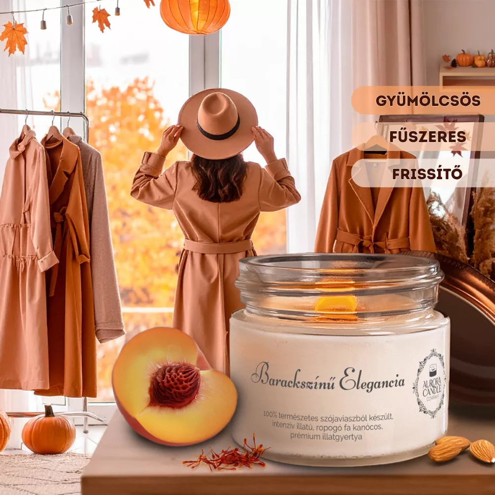 Magas koncentrációjú illatanyaggal készült szójaviasz gyertya, ropogós fa kanóccal, erőteljes, intenzív illattal.