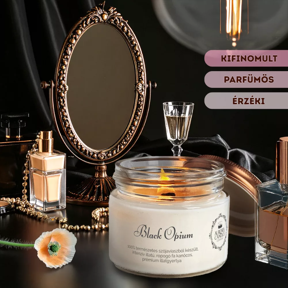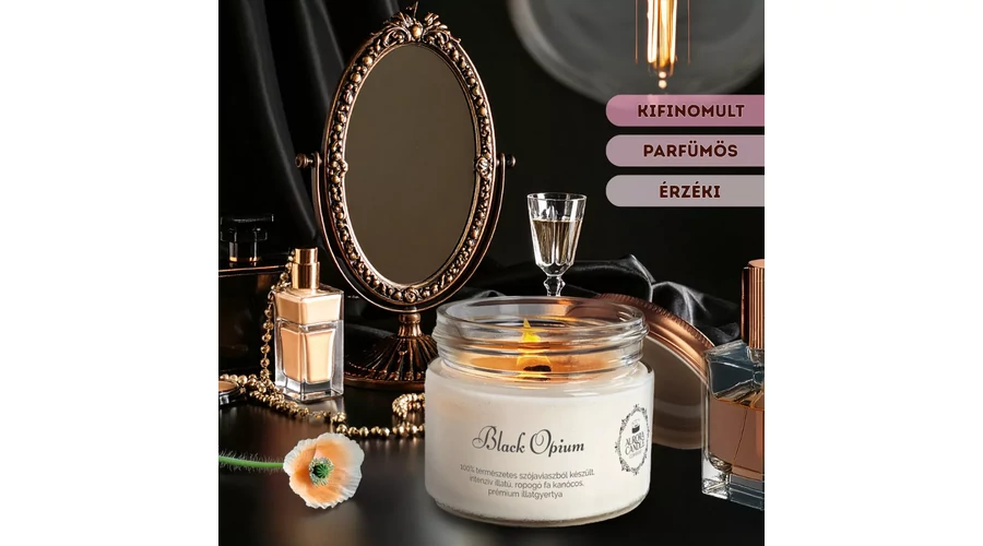 Magas koncentrációjú illatanyaggal készült szójaviasz gyertya, ropogós fa kanóccal, erőteljes, intenzív illattal.